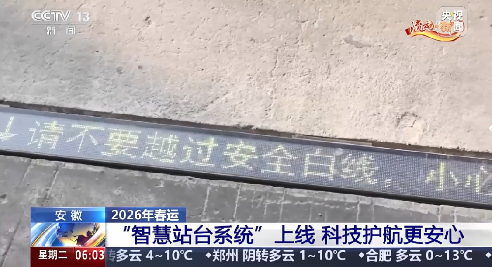 蚌埠火车站启用“智慧站台系统” 护航2026年春运出行来源:央视总台安徽总站今天是2026年春运第一天,为了确保春运期间旅客出行的安全与便捷,今年,蚌埠火车站除了优化售票组织、加强站务服务等措施外,还增加“智慧站台”建设,积极做好春运保障。在蚌埠火车站站台上,一套全新的“智慧站台系统”已投入试用,只要乘客越过站台安全警戒线,就会······